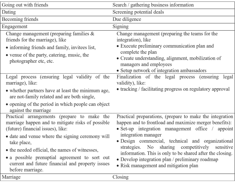 The meeting of other people, the dating, the introduction to the parents, the engagement, the clearance of the registry of citizens, the signatures…quite a process! In fact, it does not seem too far off to see the parallel to business life when organizations come together. There, in the Merger & Acquisition world, one however uses other words like search, due diligence, signing and closing. Another kind of jargon. See below a (vastly simplified) overview of some parallels.