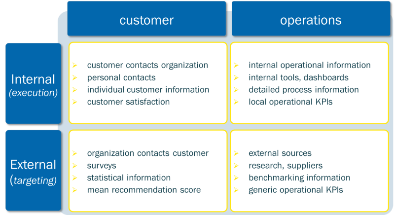 A key source is ‘the customer’: not only existing customers and prospects, but also customers who are being served by the competition, and even customers in other industries. These different types have different traits. First of all, the origin is different: either it is the customer who contacts the organisation, or it is the other way around. The type of information is different too. In the first case these are individual contacts, in which the subject is an individual, specific issue of a customer. In the second case, the information comes from surveys: the ‘source’ is anonymous, and via a grid of questions, statistical valid generic information is obtained. Valid, but generic, so not too practical to translate into action.