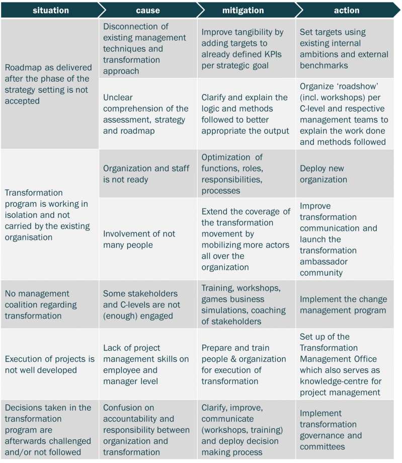 In the figure below some typical examples are given of situations that a transformation program might be in, and the consequent actions to be taken to overcome the problems.
